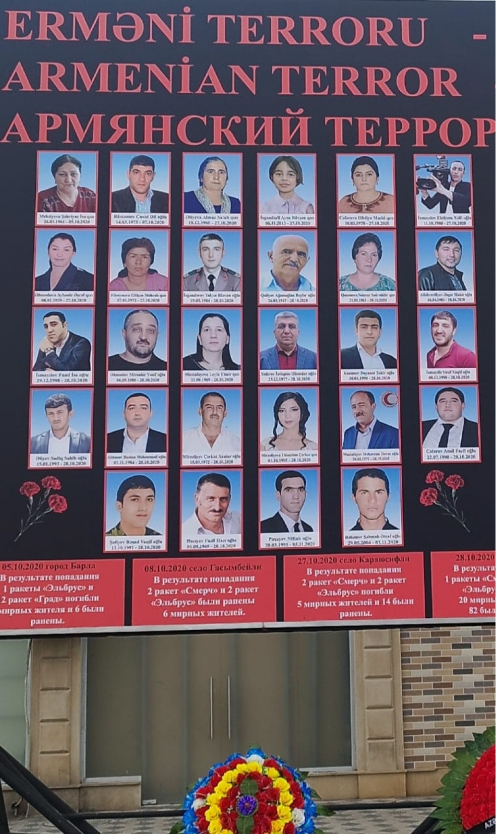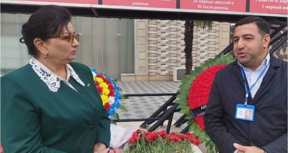 Sonda Bərdə terror qurbanlarının xatirəsinə salınmış kompleksin önündə şəkil çəkdirilib.