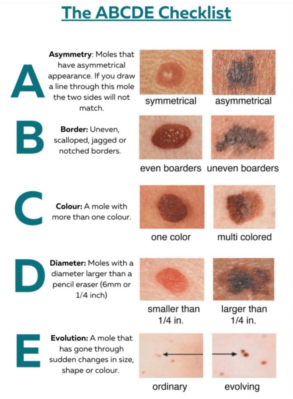 Onkoloq Dursun Əliyev mövzu ilə bağlı “İki sahil” ə açıqlamasında qeyd edir ki, dəri xərçənglərinin ən təhlükəlisi dəri melanomasıdır. Melanoma melanositlərdən- dəridə rəng piqmenti istehsal edən hüceyrələrin mutasiyasından yaranır. O bildirir ki, əgər bu əlamətlərdən bir və ya bir neçəsini müşahidə edildiyi halda, dərhal həkimə müraciət olunmalıdır: “Asimmetriya- xalq arasında “xal” adlanan ləkəyə xətt çəksəniz, iki yarısı bir-birindən fərqlənir, simmetrik deyil; Sərhədlər- yaxşı xassəli xalın sərhədləri düz və hamardır. Melanomada isə sərhədlər buruqlu, qırıq-qırıq və qeyri-bərabər olur; Rəng- normal xallar adətən tək rəng olur. Melanomalar çox rəngli ola bilər- qəhvəyi, tünd qara, bəzən qırmızı, mavi və ya başqa tonlar; Diametr- melanomalar adətən 6 mm- dən böyük olur (qələm silgisi qədər). Bəzən kiçik ölçüdə başlayıb zamanla böyüyə bilər; Dəyişiklik- hər hansı xalda böyümə, rəng bərabərsizliyi və ya forma dəyişikliyi, qanama, qaşınma və ya qabıqlanma varsa.
