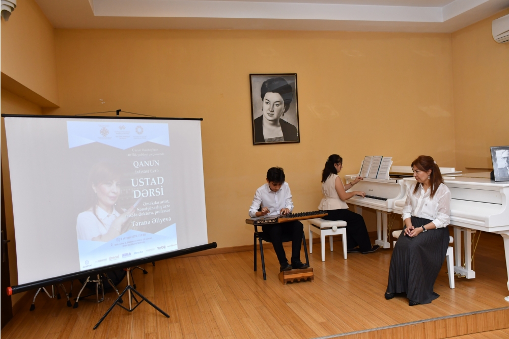 Əməkdar artist, sənətşünaslıq üzrə fəlsəfə doktoru, professor Təranə Əliyevanın iştirakı ilə keçirilən dərsdə şagirdlərin ifası dinlənilib. T.Əliyeva qanun alətinin spesifik xüsusiyyətləri barədə məlumat verib, ifaçılıq texnikası ilə bağlı tövsiyələrini diqqətə çatdırıb.