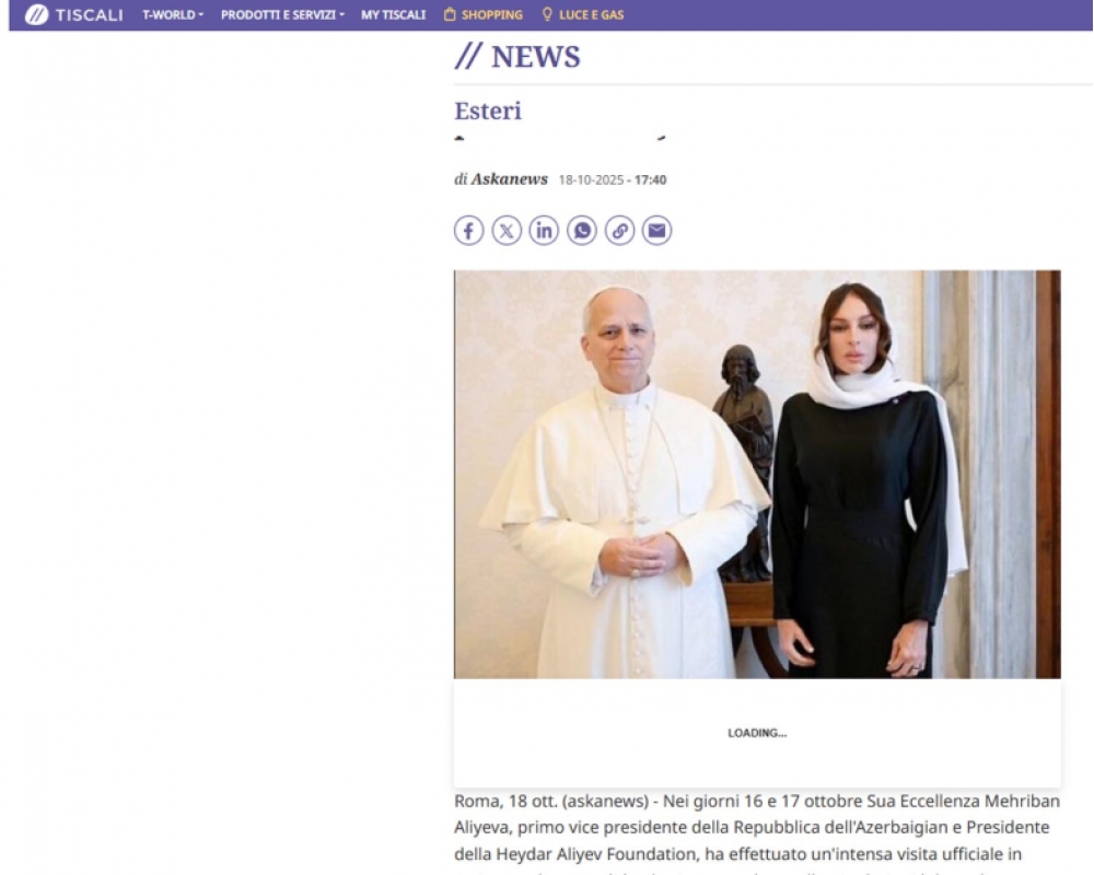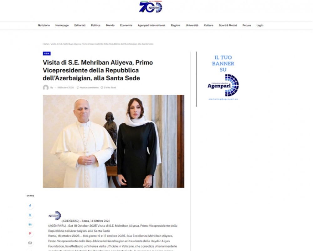 “İki sahil” xəbər verir ki, “Askanews” və “Italpress” xəbər agentlikləri, eləcə də “Agenparl” və “Notizie Tiscali” portallarının yaydığı materiallarda Birinci vitse-prezident Mehriban Əliyevanın səfərinin gərgin gündəmdə və çoxsaylı yüksəksəviyyəli görüşlərdə öz əksini tapdığı, Azərbaycan ilə Vatikan arasında mükəmməl ikitərəfli münasibətlərin daha da möhkəmləndirilməsi və getdikcə fəallaşan mədəni, elmi və diplomatik əməkdaşlıq çərçivəsində baş tutduğu bildirilir.