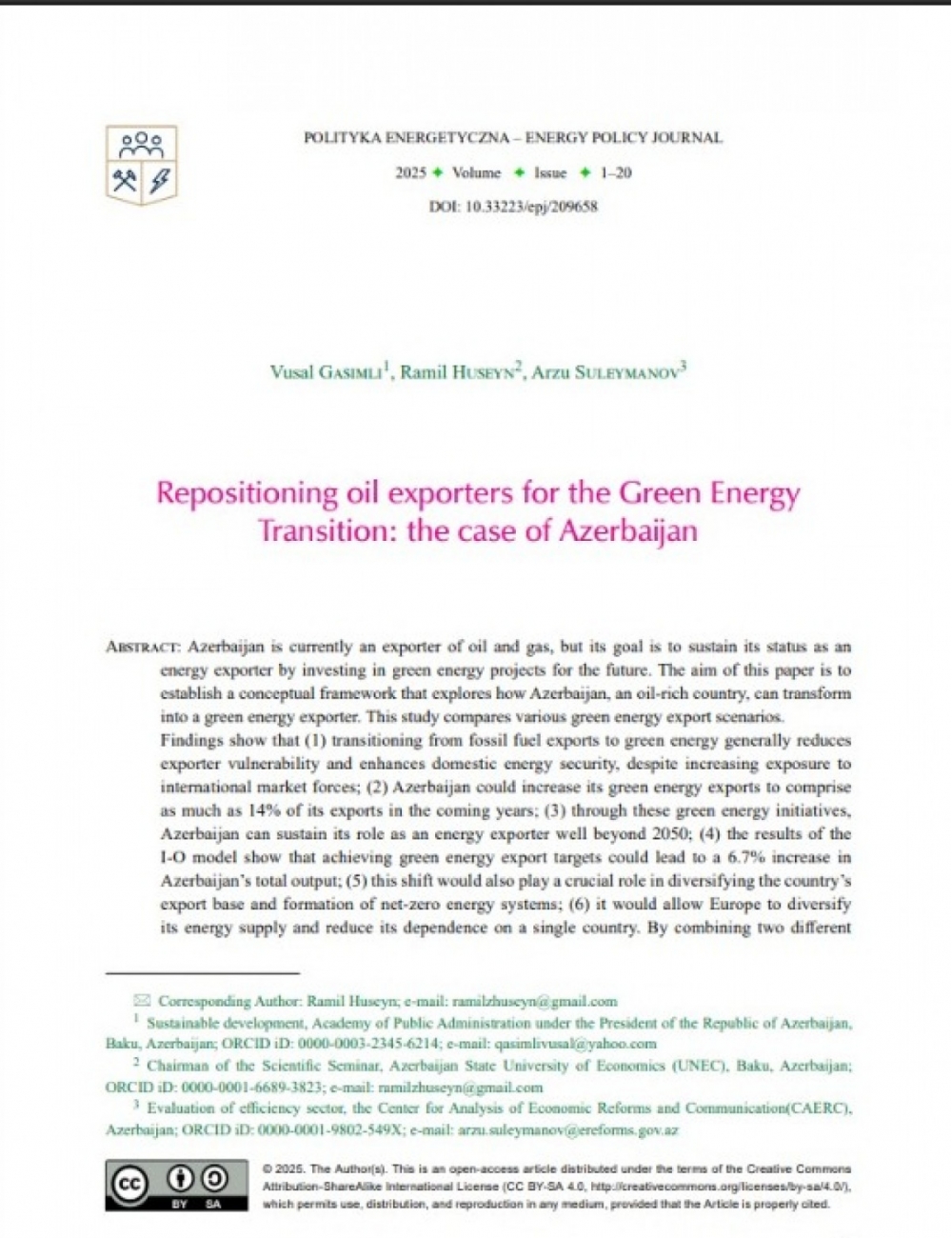 “İki sahil” xəbər verir ki, Azərbaycan Respublikasının yaşıl enerjiyə keçid siyasətindən bəhs edən məqalə  “Repositioning oil exporters for the Green Energy Transition: the case of Azerbaijan” adlanır. Məqalənin digər həmmüəllifləri iqtisad elmləri doktoru Ramil Hüseyn və iqtisad üzrə fəlsəfə doktoru Arzu Süleymanovdur.