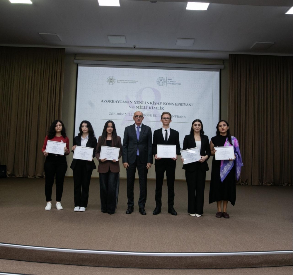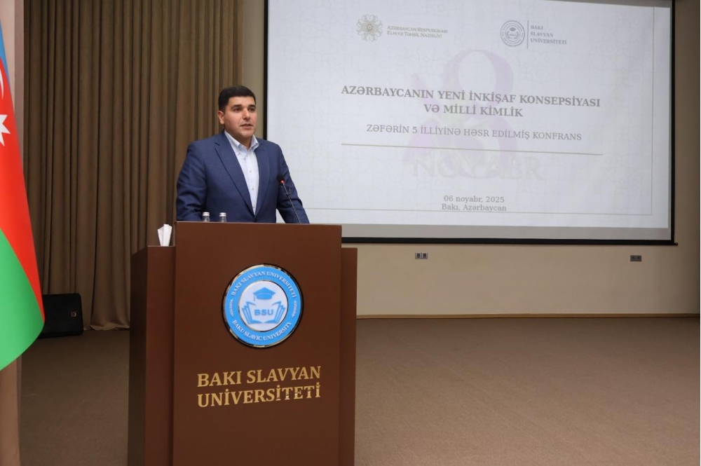 Noyabrın 6-da Bakı Slavyan Universitetində (BSU) “Zəfər Həftəsi” çərçivəsində “Konstitusiya və Suverenlik İli" Tədbirlər Planına uyğun olaraq Zəfərin 5 illiyinə həsr olunmuş  " Azərbaycanın Yeni İnkişaf Konsepsiyası və Milli Kimlik " mövzusunda konfrans keçirilib. Konfransda BSU-nun rektoru Anar Nağıyev,  elm və təhsil nazirinin müavini Firudin Qurbanov,  Milli Məclisin deputatları Sahib Alıyev,  Zahid Oruc, Azərbaycan Respublikasının Prezidenti yanında Dövlət İdarəçilik Akademiyasının(DİA) rektoru Urxan Ələkbərov, Cənubi Qafqaz Tədqiqatlar Mərkəzinin (CQTM)  direktoru Fərhad Məmmədov, BSU-nun professor-müəllim heyəti, tələbələri və digər universitetlərin tələbələri də iştirak ediblər.