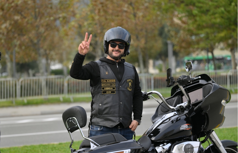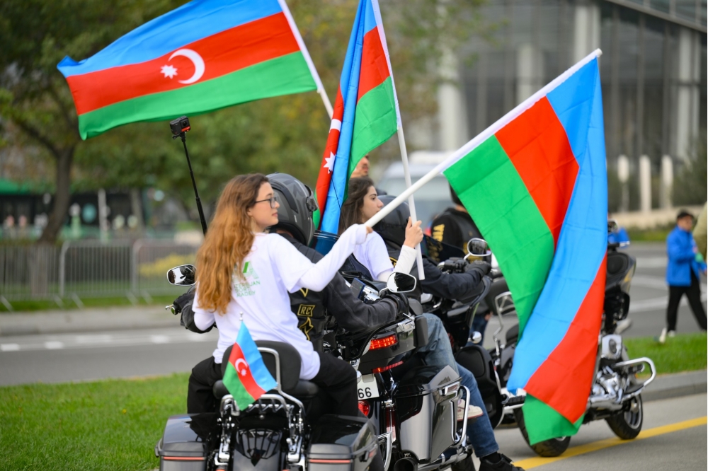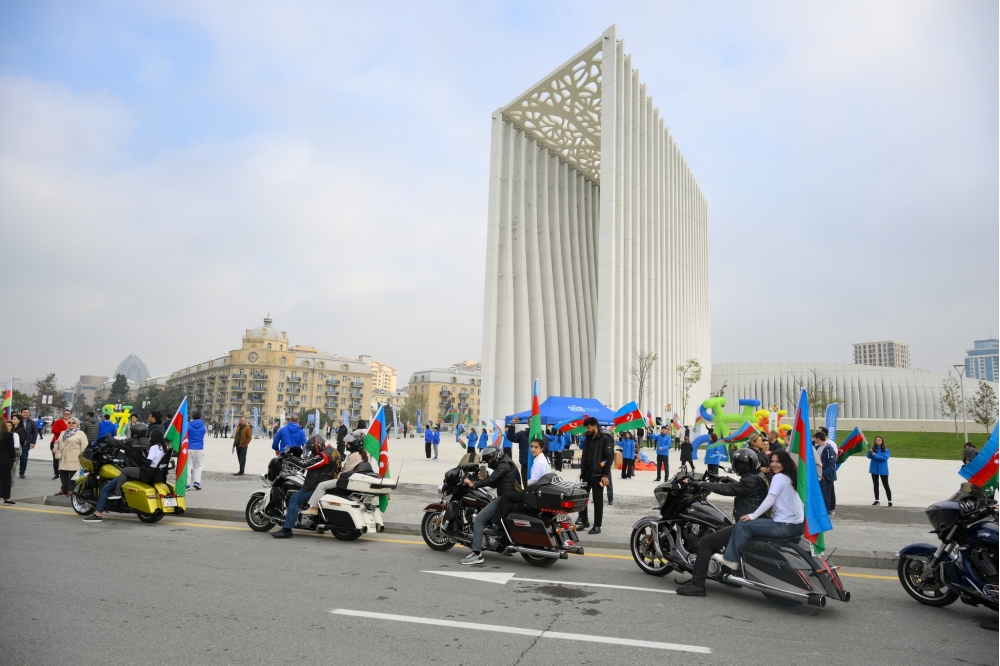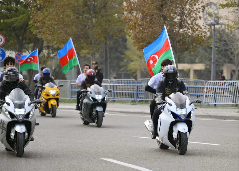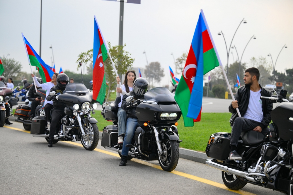 "Crescent Mall"un yaxınlığından Zəfər Parkınadək iştirakçıları Azərbaycan bayraqlarını daşıyan motosikletçilər müşayiət edib.