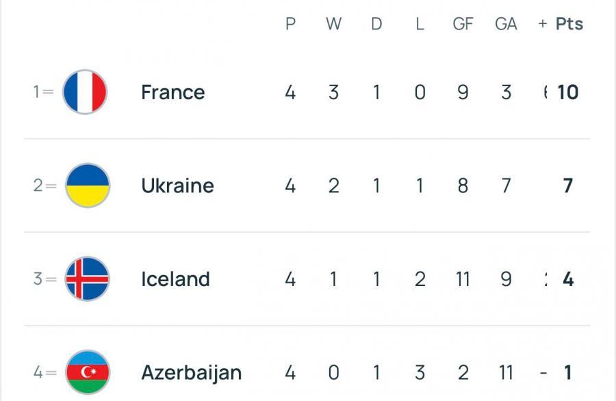 Hazırda D qrupunun turnir cədvəlində Fransa 10 xalla liderdir. Ukrayna 7 xalla 2-ci, İslandiya 4 xalla 3-cüdür. Aktivində 1 xal olan Azərbaycan yığması isə 4-cü - sonuncu pillədə qərarlaşır.