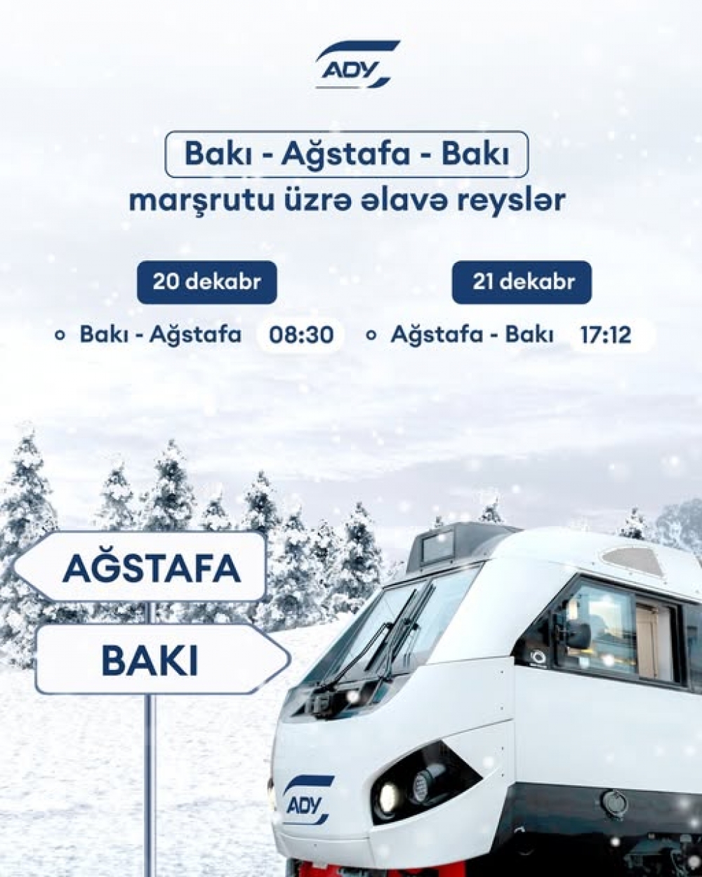 "Azərbaycan Dəmir Yolları" QSC (ADY) artan sərnişin tələbatını təmin etmək məqsədilə 20 və 21 dekabr tarixlərində Bakı-Ağstafa-Bakı istiqamətində əlavə qatar reysləri təyin edib.