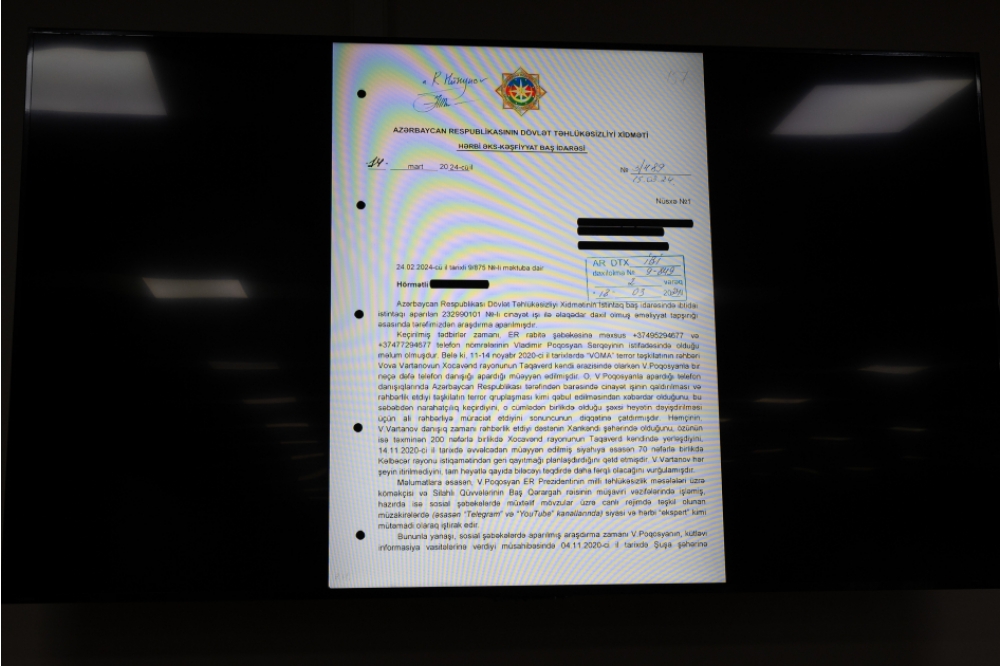 Keçirilmiş əməliyyat tədbirləri zamanı V.Vartanovun mütəmadi əlaqə saxladığı R.Vardanyanla “VoMa” terror təşkilatında döyüşçülərin və təlimatçıların hazırlanması, təlimlərin təşkili və bununla da Ermənistan ordusunun qalıqları və qanunsuz erməni silahlı dəstələrinin Azərbaycan Silahlı Qüvvələrinə qarşı terror aktlarını törətmələri və döyüşlərdə iştirak etmələrinə dair müzakirələr apardıqları, eləcə də bu terrorçu təşkilatın və onların üzvlərinin maliyyələşdirilməsini R.Vardanyanın öz üzərinə götürdüyü müəyyən edilib.