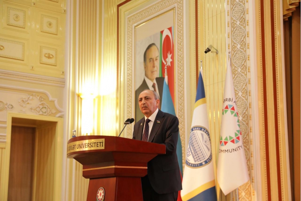 Rektor vurğulayıb ki, Azərbaycan Respublikasının Prezidenti İlham Əliyev Qərbi Azərbaycana qayıdışla bağlı mövqe və baxışlarını bir çox çıxışlarında, xüsusilə 2022-ci il dekabrın 24-də İcmanın rəhbər heyəti ilə görüşündə və sonuncu dəfə cari il noyabrın 3-də  AMEA-nın 80 illik yubileyindəki çıxışında bir daha bəyan edib. Bu çıxış Qərbi Azərbaycan məsələsinin elmi əsaslandırılması baxımından strateji əhəmiyyətli sənəd kimi qiymətləndirilə bilər: “Bu çıxışla Prezident İlham Əliyev elm və təhsil müəssisələrinə Qərbi Azərbaycan məsələsinin dövlət siyasətinin tərkib hissəsi, onun elmi əsaslandırılmasının milli vəzifə olmasına dair açıq mesaj verib. Bakı Dövlət Universiteti də sistemli elmi-tədqiqat işləri aparmaqla, akademik, sosial-mədəni layihələrlə bu istiqamətdə əhəmiyyətli töhfələr verəcək. Ötən il BDU-da yaradılan Qərbi Azərbaycan Araşdırmalar Mərkəzi bu istiqamətdə fəaliyyətimizdə xüsusi rol oynayacaq. Bakı Dövlət Universiteti Qərbi Azərbaycan məsələsində əsas intellektual mərkəzlərdən biri rolunu oynaya bilər. Universitetin bu prosesə potensial töhfəsi xüsusi tədqiqat mərkəzinin yaradılması, multidissiplinar elmi layihələrin icrası, beynəlxalq konfrans və simpoziumların təşkili, Qərbi Azərbaycanla bağlı xüsusi kurs və proqramların tədrisi və digər tədbirlərdən ibarət olacaq. Qərbi Azərbaycana qayıdış ideyası müasir mərhələdə yalnız siyasi iradə deyil, eyni zamanda elmi əsaslandırma, akademik tədqiqatlar və beynəlxalq hüquqi arqumentlər tələb edir. Bu baxımdan ali təhsil müəssisələrinin və elmi-tədqiqiat institutlarının üzərinə mühüm tarixi məsuliyyət düşür”.