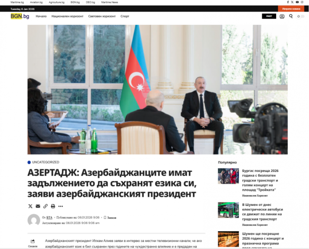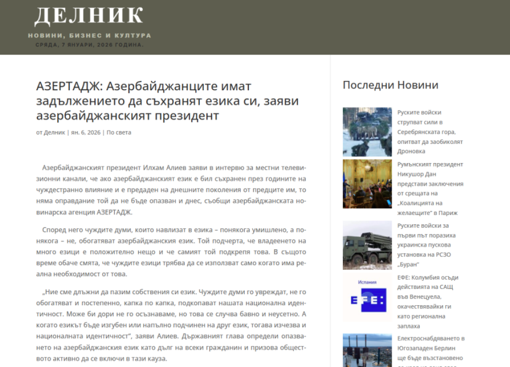 Bolqarıstan Teleqraf Agentliyinin, “Delnik” nəşrinin, BGN xəbər portalının AZƏRTAC-a istinadla dərc etdikləri “Azərbaycan Prezidenti azərbaycanlıların öz dövlət dilini qorumalarının vacibliyini vurğulayıb” sərlövhəli məqalədə Prezident İlham Əliyevin dövlət dilinin qorunması və inkişafı ilə bağlı fikirləri yer alıb.