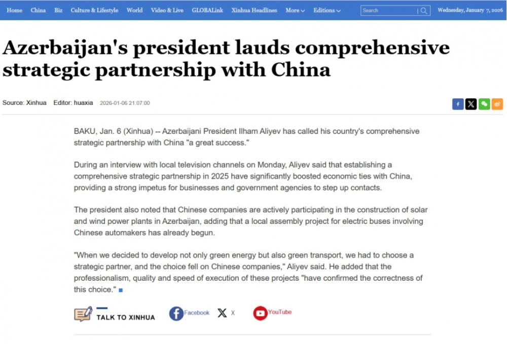 “Sinxua” Prezident İlham Əliyevin “Biz təkcə yaşıl energetikanı deyil, həm də yaşıl nəqliyyatı inkişaf etdirmək qərarına gəldikdə, gündəmdə strateji tərəfdaş seçmək məsələsi dayandı və Çin şirkətlərini seçdik” sitatını da xəbərə daxil edib.