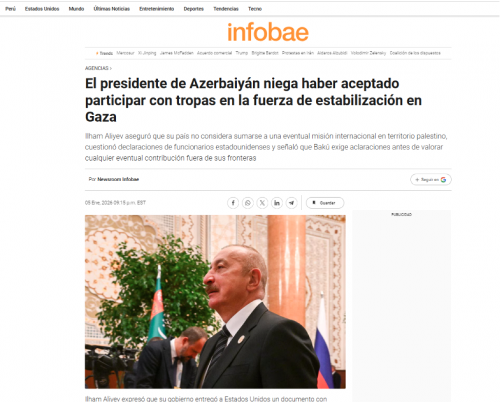 İspaniyanın “Communicacion” portalının AZƏRTAC-a istinadla dərc etdiyi materiallarda qeyd olunub ki, Prezident İlham Əliyev Azərbaycan hərbçilərinin ölkənin hüdudlarından kənarda heç bir hərbi əməliyyatlarda iştirak etmədiyini və bunun gələcəkdə də nəzərdə tutulmadığını bildirib. İspan saytı bununla bağlı yanlış məlumatları təkzib edən dövlətimizin başçısının sözlərini sitat gətirir: “Biz 20 sualdan ibarət müraciət tərtib etdik və onu Amerika tərəfinə çatdırdıq. Bu məsələlərə aydınlıq gətirilməyincə, Azərbaycanın hər hansı missiyada heç bir iştirakı nəzərdə tutulmur”.
