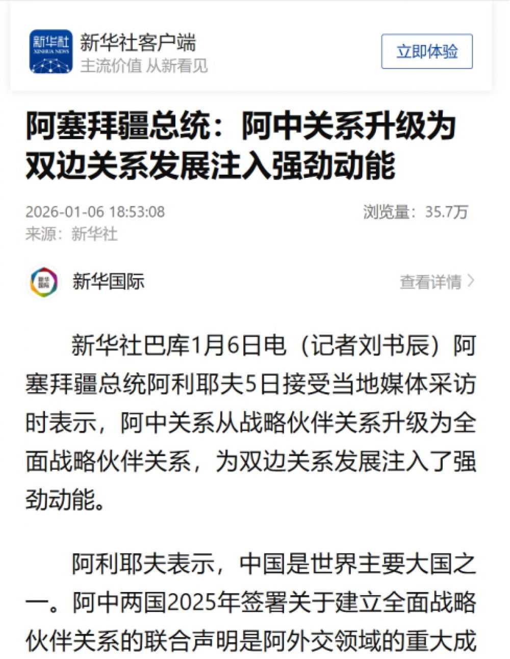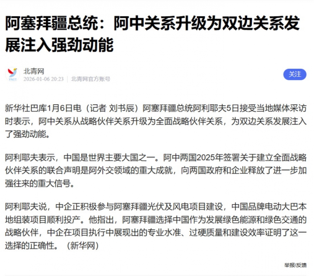 “Azərbaycan Prezidenti Çinlə hərtərəfli strateji tərəfdaşlığı yüksək qiymətləndirir” adlı Çin və ingilis dilində hazırlanan xəbərdə dövlətimizin başçısının iki ölkə arasında hərtərəfli strateji tərəfdaşlıq münasibətlərinin qurulmasını böyük uğur kimi dəyərləndirdiyi qeyd olunub. Vurğulanıb ki, Azərbaycan Prezidenti hərtərəfli strateji tərəfdaşlığın iki ölkə arasında iqtisadi əlaqələrin inkişafına böyük təkan verdiyini, biznes və dövlət strukturlarına əlaqələri fəallaşdırmaq üzrə ciddi impuls verdiyini deyib.