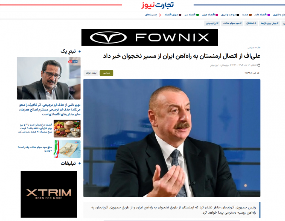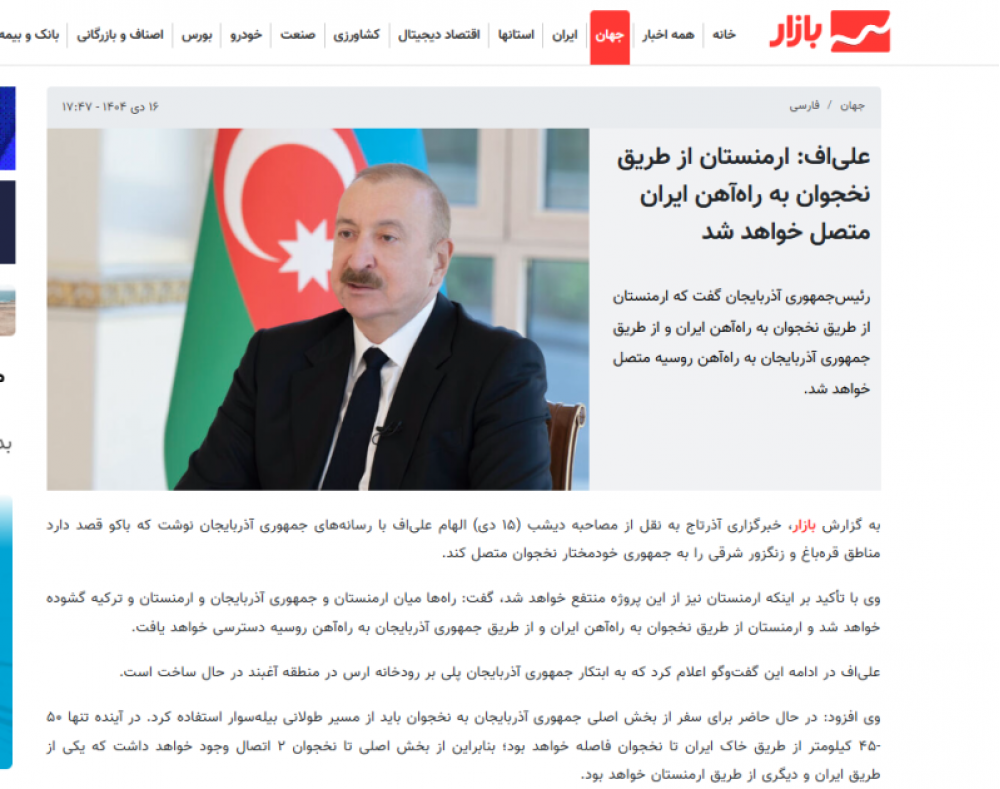 İranın IRNA dövlət agentliyinin, ISNA xəbər agentliyinin saytlarında, “Ğatreh”, “Tahlil Bazar”, “Tejaratnews” xəbər portallarında dərc olunmuş “Prezident Əliyev Ermənistanın Naxçıvan marşrutu ilə İran dəmir yoluna qoşulacağını bəyan edib” sərlövhəli məqalələrdə Azərbaycanın dövlət başçısının Ermənistanın Naxçıvan vasitəsilə İran dəmir yoluna, Azərbaycan Respublikası vasitəsilə isə Rusiya dəmir yoluna çıxış əldə edəcəyi barədə fikirləri yer alıb. Materiallarda vurğulanır ki, Prezident İlham Əliyev Ermənistan sərhədinə gedən həm dəmir yolunun, həm avtomobil yolunun tezliklə hazır olacağını bildirib. Azərbaycan lideri əlavə edib ki, bu layihə tam başa çatandan sonra onun yükötürmə qabiliyyəti 15 milyon tona bərabər olacaq, həm Şərq-Qərb, həm də ki, Şərq-Cənub, bəlkə də Şimal-Cənub yolunun bir qolu olacaq. Dövlət başçısı əlavə edib: “Çünki bu gün Şimal-Cənub layihəsi deyəndə, ilk növbədə, Rusiya-Azərbaycan-İran, yəni Rəşt-Astara yolu nəzərdə tutulur. Bu yol da vacibdir. Ancaq Zəngəzur dəhlizi açılandan sonra sovet vaxtı mövcud olmuş Sovet İttifaqı-İran yolu yenə də bərpa ediləcək. Yəni ki, Rusiya-Bakı-Ağbənd-Ermənistan-Naxçıvan-Culfa-Fars körfəzi – bu, Şimal-Cənub marşrutunun ikinci yolu olacaq”.