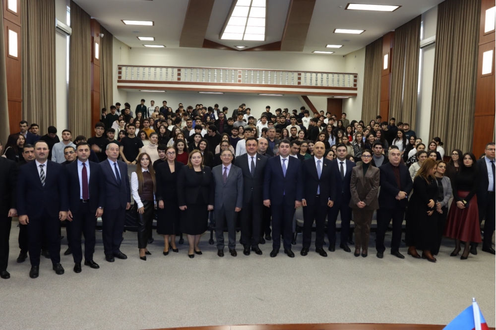 Tədbirin rəsmi hissəsindən öncə Universitetin inzibati binasında Ulu Öndər Heydər Əliyevin büstü önünə tər gül dəstələri düzülüb, Ümummilli Liderin əziz xatirəsi dərin ehtiramla yad edilib.