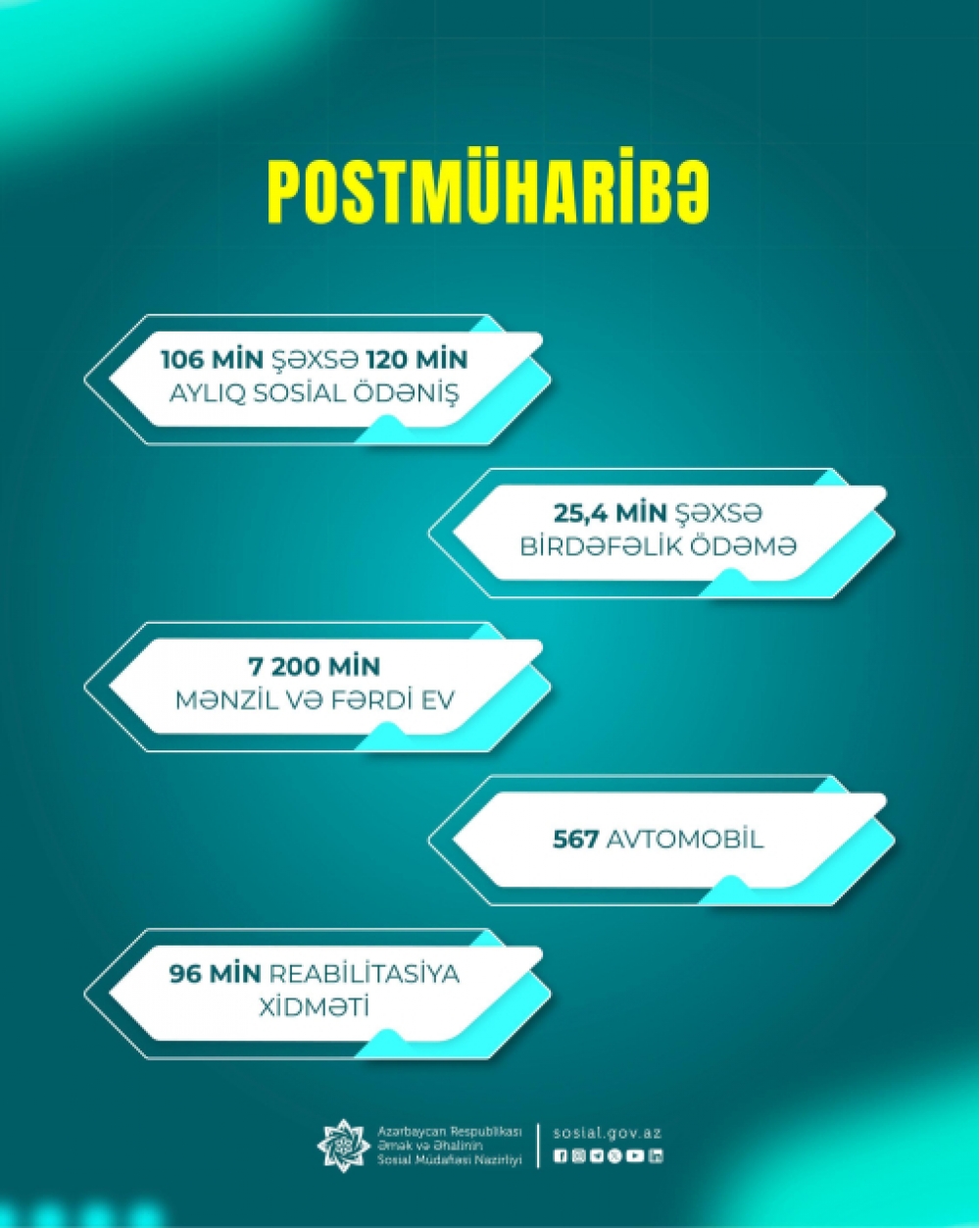 Əmək və Əhalinin Sosial Müdafiəsi Nazirliyin İctimaiyyətlə əlaqələr şöbəsindən “İki sahil”ə verilən məlumata görə, həmin sosial dəstək paketi üzrə postmüharibə dövründə şəhid ailələri üzvləri və müharibə veteranları olan 106 min şəxsə sosial ödəniş təyinatı üzrə 120 min xidmət göstərilib, 25,4 min şəxsə birdəfəlik ödəmə təyin olunub.