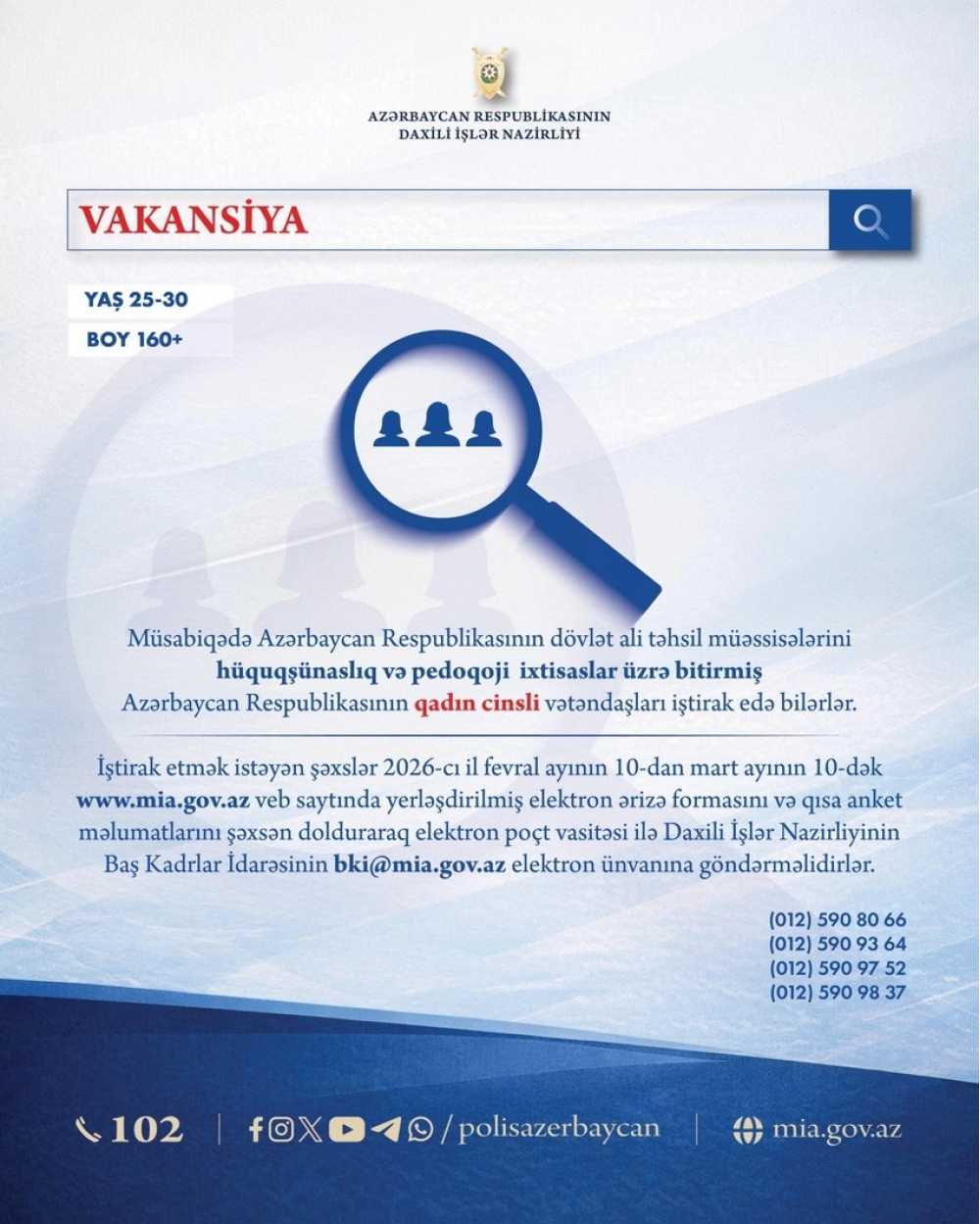 Daxili İşlər Nazirliyi (DİN) Bakı şəhərində yerləşən müvafiq qurumlarında, eləcə də respublikanın şəhər və rayon polis orqanlarında vakant olan yetkinlik yaşına çatmayanların işləri üzrə orta rəis heyəti üzrə inspektor vəzifələrinə qadın namizədlərin xidmətə qəbulunu elan edir.