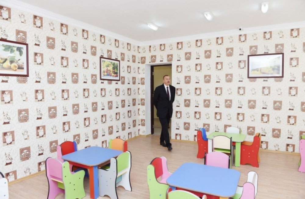 Prezident İlham Əliyev körpələr evi-uşaq bağçasının rəmzi açılışını bildirən lenti kəsdi.