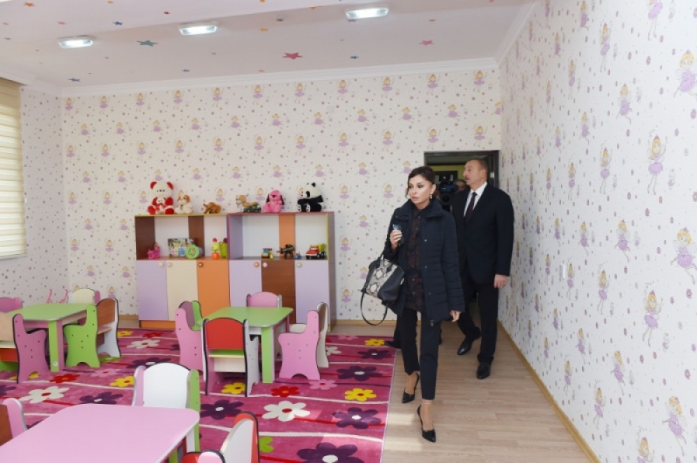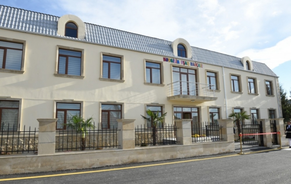 Dövlətimizin başçısına və xanımına məlumat verildi ki, körpələr evi-uşaq bağçasının inşasına 2014-cü ilin iyulunda başlanılıb. Binanın ümumi sahəsi 1200 kvadratmetrdir. İkimərtəbəli binada ümummilli lider Heydər Əliyevin, Prezident İlham Əliyevin və Azərbaycanın birinci xanımı Mehriban Əliyevanın həyat və fəaliyyətlərini əks etdirən fotolardan ibarət guşələr yaradılıb.