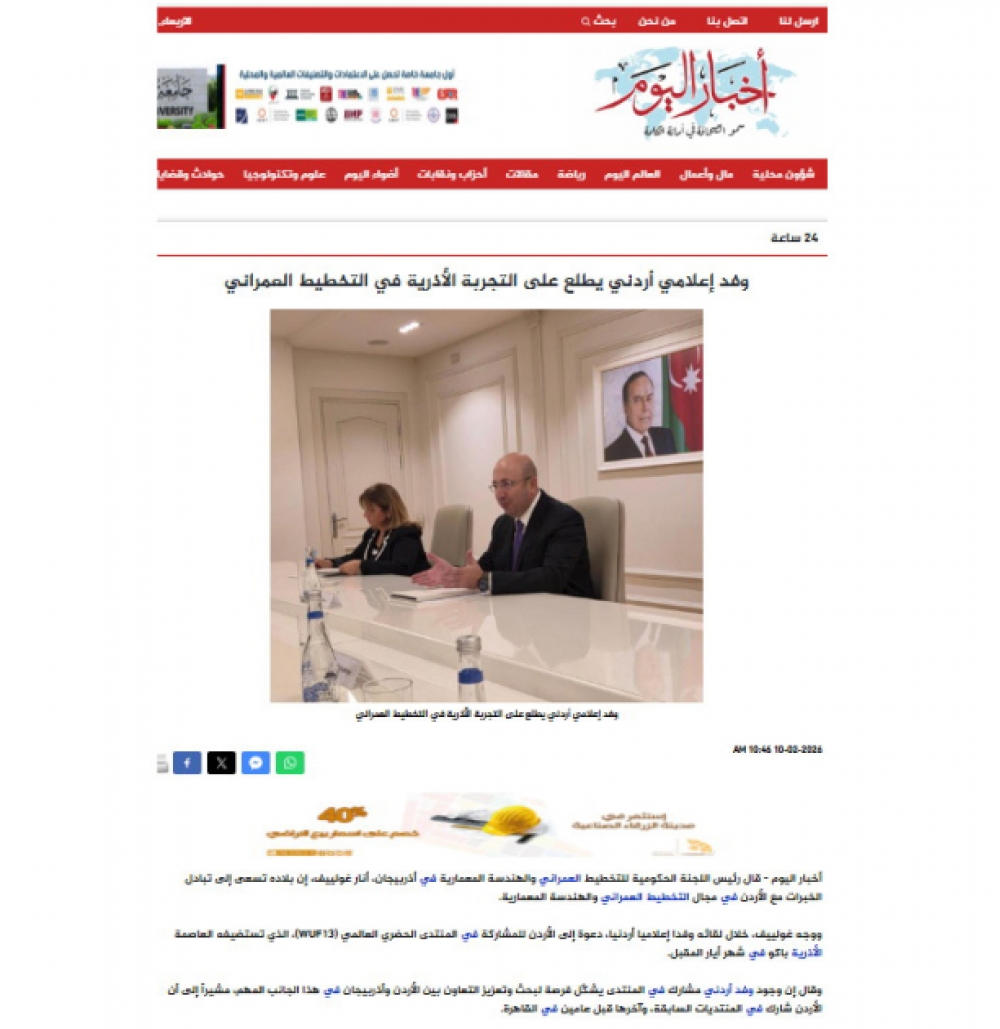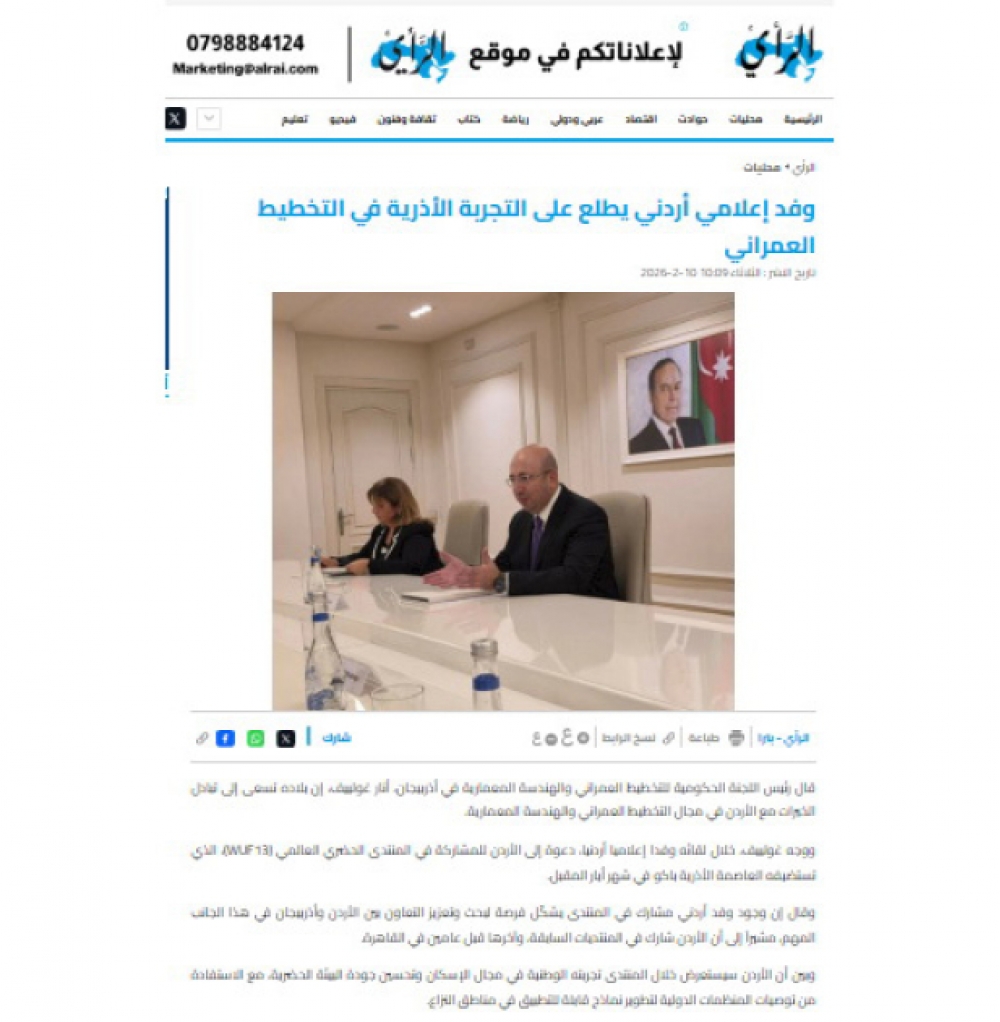 İordaniya mediasında Azərbaycanın şəhərsalma təcrübəsi, o cümlədən Bakıda keçiriləcək Ümumdünya Şəhərsalma Forumu barədə məqalələr dərc olunub.