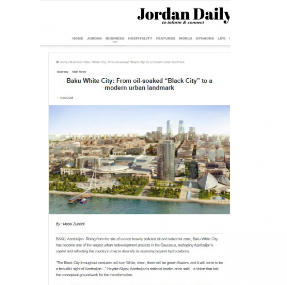 İngilisdilli “Jordan daily” qəzetindəki məqalədə “Bakı Ağ Şəhər” layihəsi barədə məlumat verilib. Qeyd olunub ki, vaxtilə çox çirklənmiş neft və sənaye zonasının yerində yaradılan Bakı Ağ Şəhər Qafqazın ən böyük şəhərsalma layihələrindən birinə çevrilib.