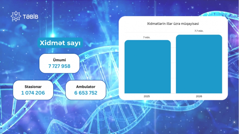 Bildirilib ki, yanvar ərzində göstərilən xidmət sayında ötən ilin eyni dövrü ilə müqayisədə artım müşahidə olunub. Belə ki, ay ərzində 7 727 958 tibbi xidmət göstərilib. Onlardan 1 074 206-sı stasionar, 6 653 752-si ambulator olub. Tibb müəssisələrində göstərilən xidmətlərin ümumi sayı ötən ilin eyni dövrü ilə müqayisədə 10% artıb.