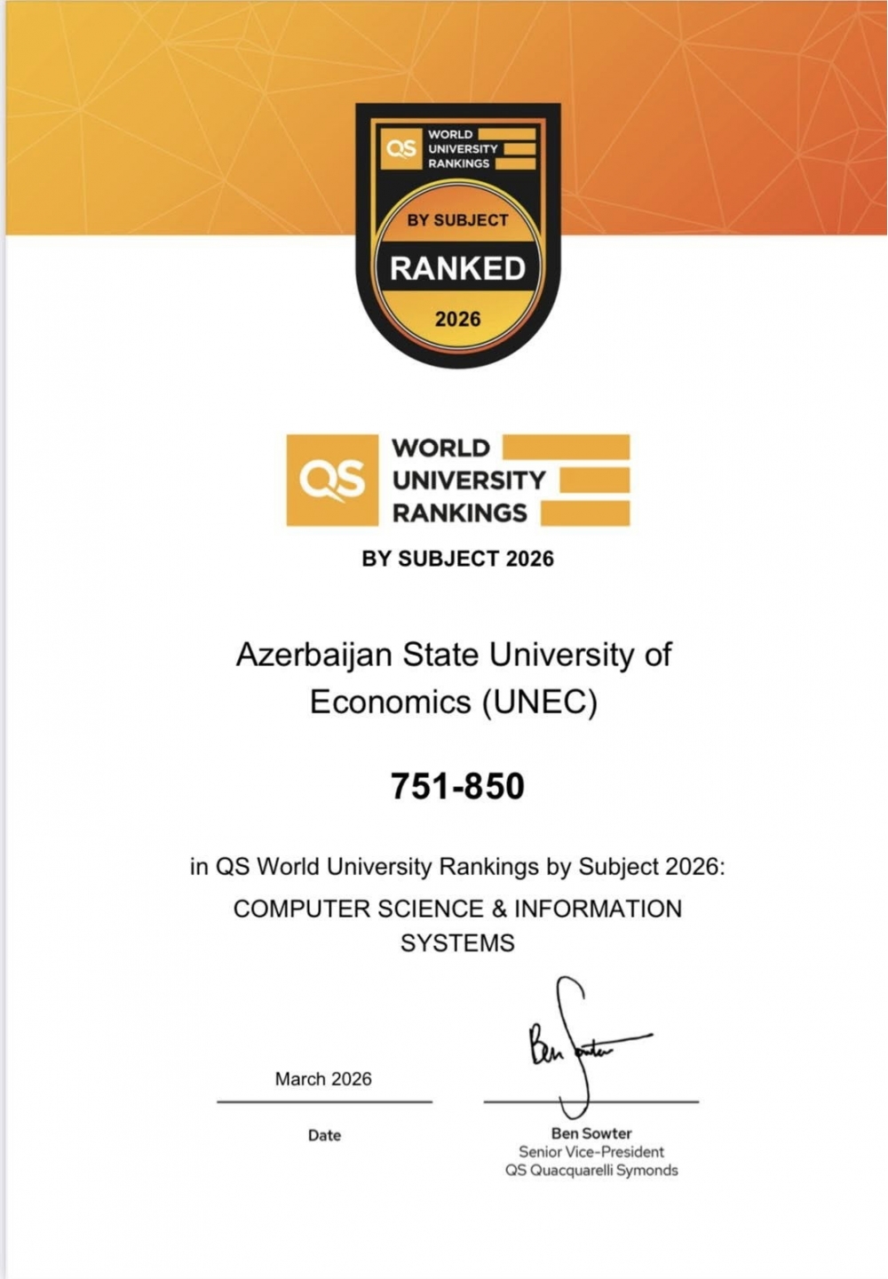 Ən önəmlisi isə UNEC 2023-2025-ci illərdə ancaq bir ixtisasla, 2026-cı ildə isə artıq 3 ixtisasla qlobal reytinqdə təmsil olunub.