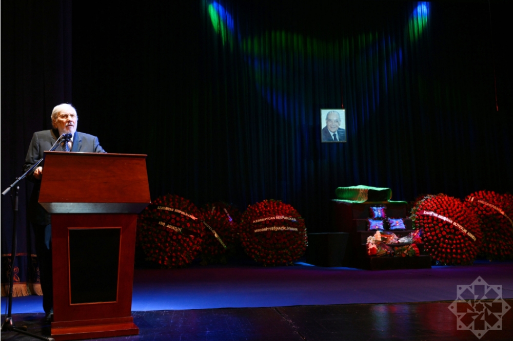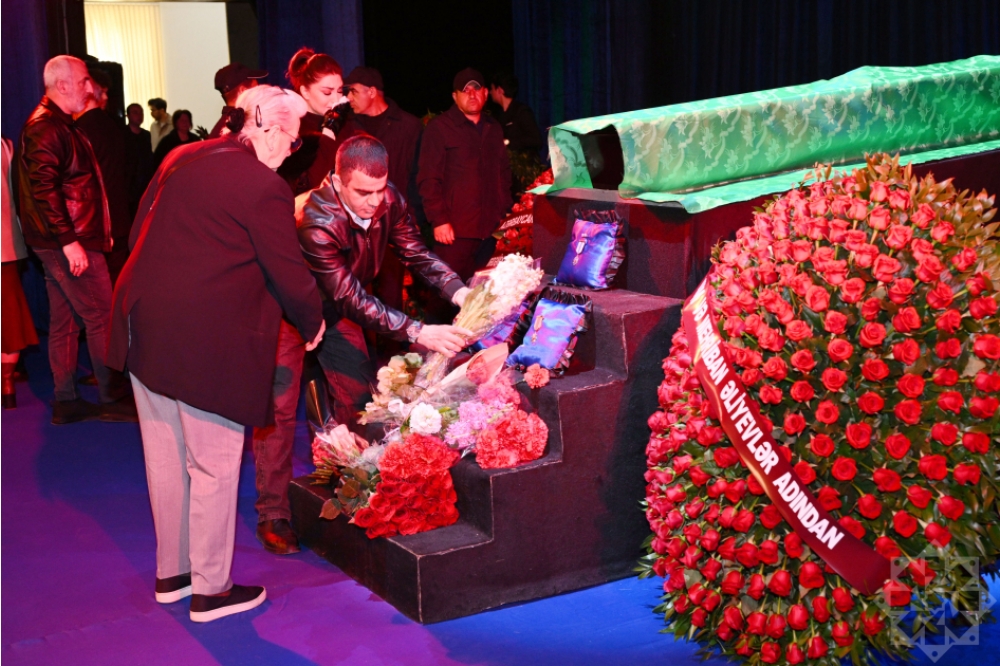 Mərhumun cənazəsi Akademik Milli Dram Teatrının matəmsayağı bəzədilən səhnəsində postament üzərinə qoyulub.