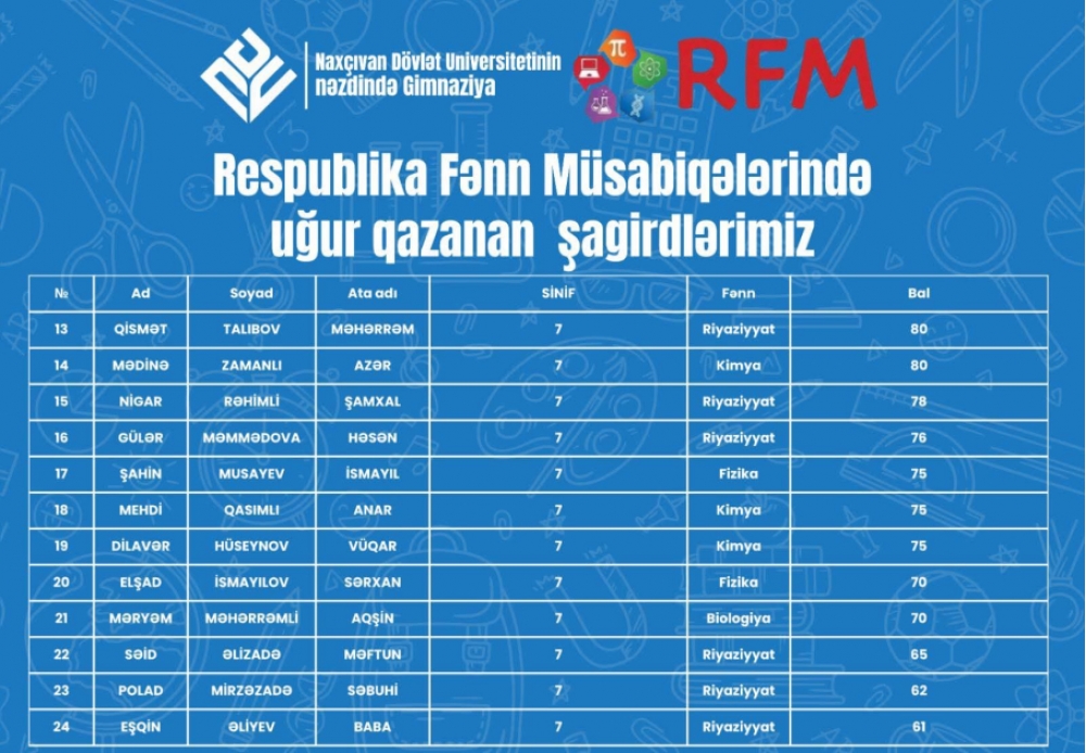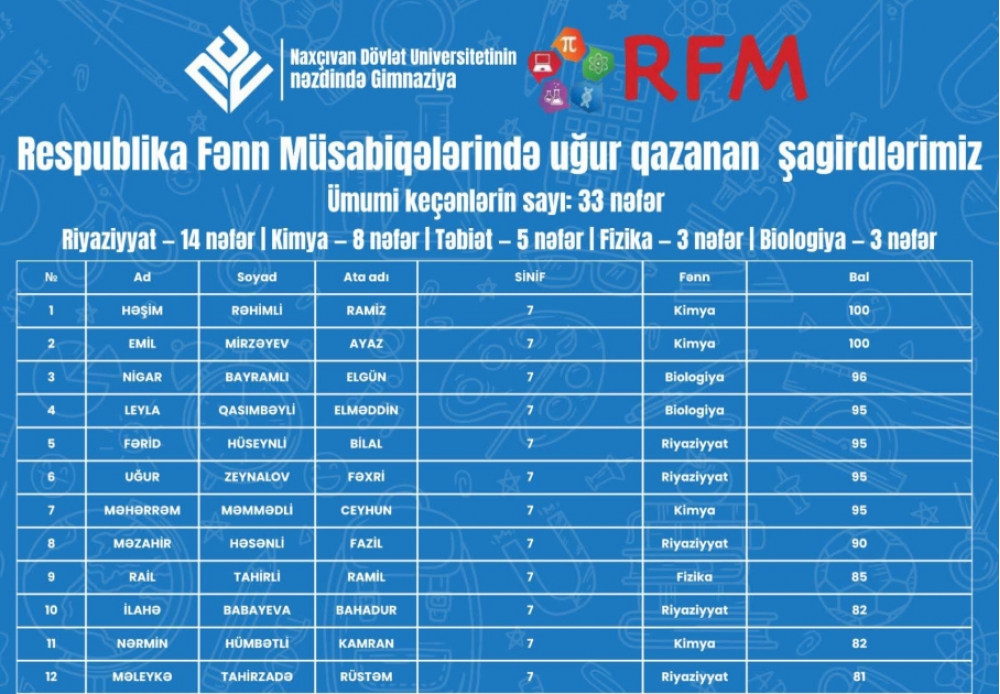“İki sahil” xəbər verir ki, bu barədə Universitetin Media və ictimaiyyətlə əlaqələr şöbəsindən bildirilib. Qeyd olunub ki, gimnaziyanın ümumilikdə 33 şagirdi müxtəlif fənlər üzrə müsabiqədə fərqlənib. Uğur qazanan şagirdlərdən 14-ü riyaziyyat, 8-i kimya, 5-i təbiət elmləri, 3-ü fizika, 3-ü isə biologiya fənni üzrə yüksək nəticələr göstəriblər. Bu nəticələr şagirdlərin bilik və bacarıqlarının, eləcə də tədris prosesinin keyfiyyətinin göstəricisidir. Gimnaziyada yaradılan müasir tədris mühiti və müəllim heyətinin peşəkarlığı əldə olunan uğurlarda mühüm rol oynayır.