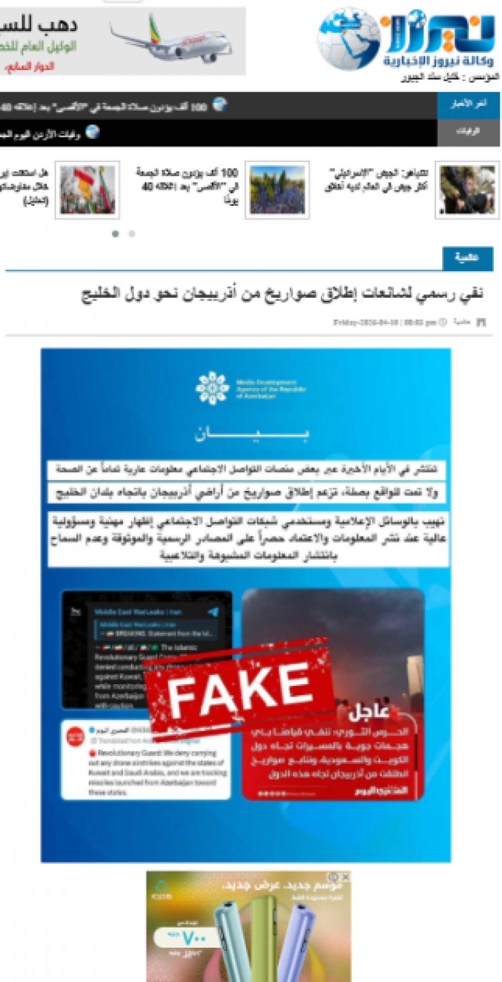 Son günlər bəzi sosial media platformalarında Azərbaycan ərazisindən Körfəz ölkələri istiqamətində guya raketlərin buraxılması ilə bağlı tamamilə əsassız və həqiqətəuyğun olmayan məlumatlar yayılıb. İordaniyanın rəsmi “Petra” xəbər agentliyi, eləcə də “əl-Dustur”, “əl-Bələd”, “Neyruz” və digər xəbər portalları Azərbaycanın Əmmandakı səfirliyinin bununla əlaqədar bəyanatını dərc edib.