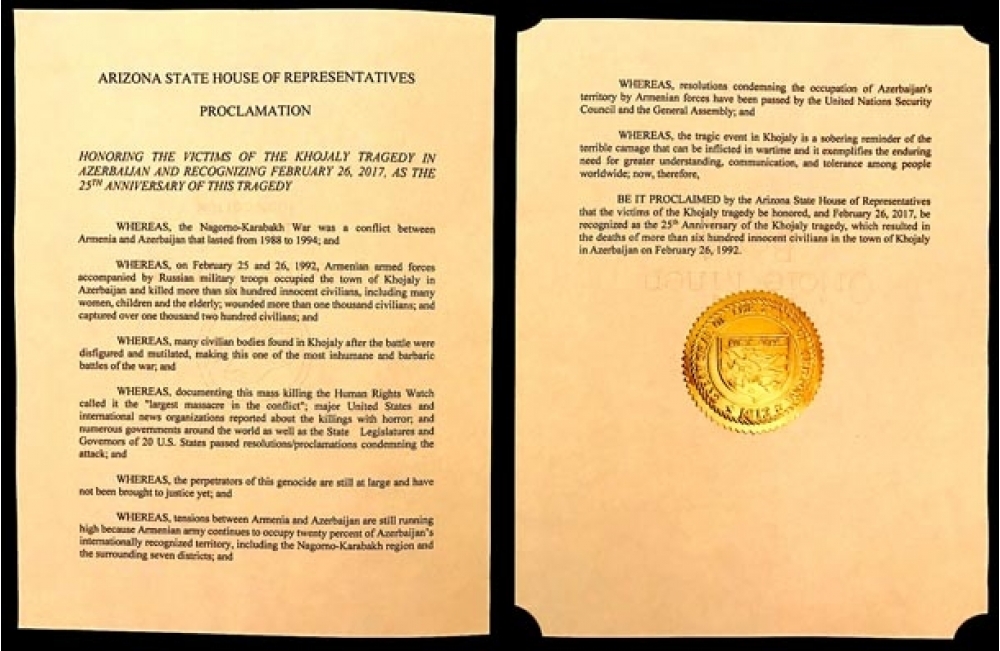 Sonda, Arizona Ştatının Nümayəndələr Palatası tərəfindən 26 fevral 2017-ci il tarixinin Xocalı faciəsinin 25-ci ildönümü kimi tanındığı və faciənin qurbanlarının yad edildiyi bildirilir.