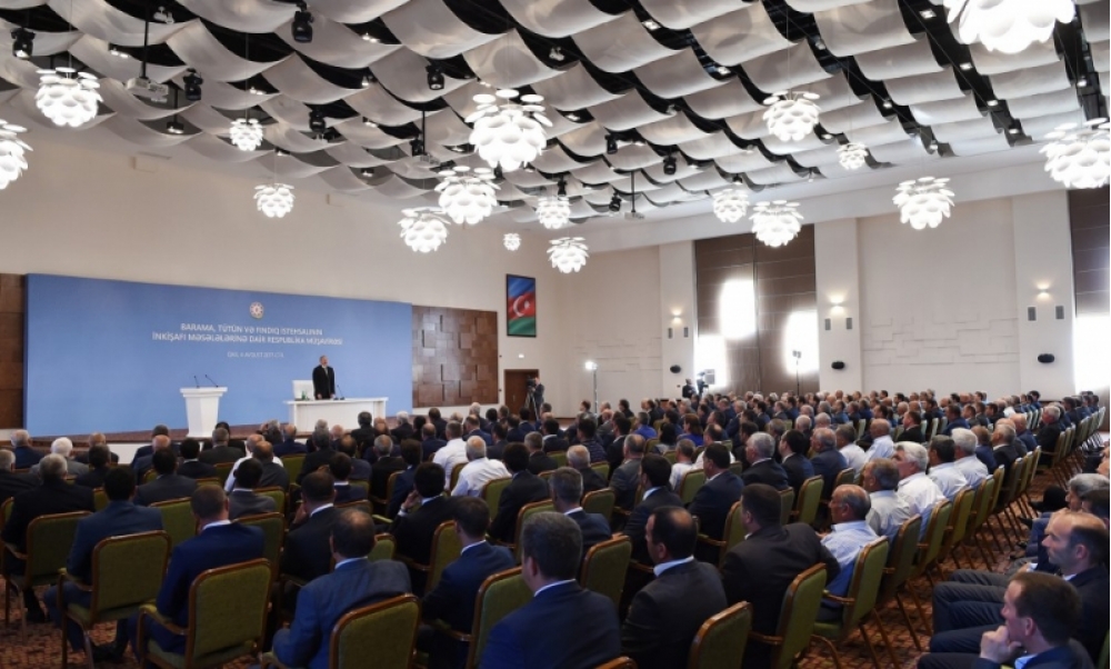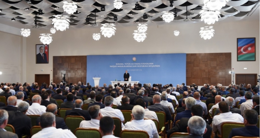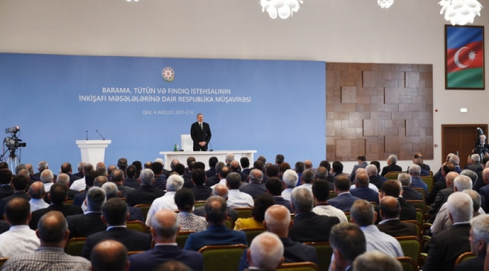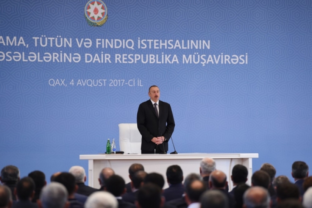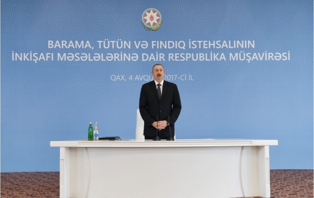 Bugünkü müşavirə bu bölgəyə xas olan ənənəvi kənd təsərrüfatı sahələrinin inkişafına həsr edilib. Tütünçülük, baramaçılıq, fındıqçılıq bu bölgədə əsrlər boyu inkişaf etmişdir. Bu sahələrin ölkəmizdə çox böyük və zəngin ənənələri vardır. Burada mövcud olan torpaq şəraiti, torpağın münbitliyi, iqlim, coğrafi vəziyyət, xarici bazarlara yaxın olmağımız və qədim İpək yolu üzərində yerləşməyimiz – bütün bunlar bu sahələrin inkişafına təkan vermişdir. Azərbaycan xalqı əsrlər boyu bu sahələrdə çalışırdı və yaxşı nəticələr əldə edirdi. Statistikaya baxdıqda görürük ki, tütünçülüyün, baramaçılığın, fındıqçılığın ən uğurlu və sürətli inkişaf dövrü ulu öndər Heydər Əliyevin adı ilə bağlıdır. Məhz onun fəaliyyəti nəticəsində 1970-1980-ci illərin əvvəllərində bu sahələrdə böyük inkişaf təmin edilmişdir. O vaxt bu sahələrdə görülən işlər deməyə əsas verir ki, biz bu gün bu sahələri uğurla bərpa edə bilərik. Nəinki bu sahələr, kənd təsərrüfatının pambıqçılıq, üzümçülük və digər sahələri də Heydər Əliyevin rəhbərliyi ilə uğurla inkişaf etmişdir. Biz bu ənənəvi sahələri bu gün bərpa edirik.