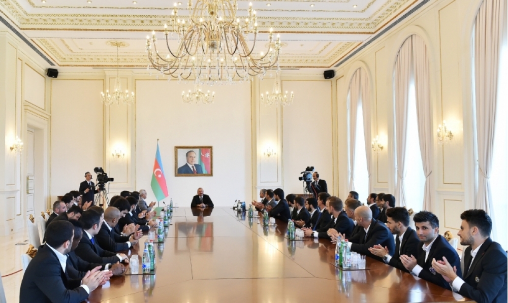 - Dünən ölkəmizin futbol tarixinin yeni səhifəsi açılmışdır. “Qarabağ” futbol klubu UEFA Çempionlar Liqasının qrup mərhələsinə vəsiqə qazanmışdır. Bu tarixi qələbə münasibətilə sizin hamınızı ürəkdən təbrik edirəm. Siz Azərbaycan xalqına qələbə sevinci bəxş etdiniz. Siz gərgin mübarizədə bir daha göstərdiniz ki, Azərbaycan idmançısı, Azərbaycan vətəndaşı öz xalqına, dövlətinə bağlıdır, güclüdür, peşəkardır və ölkəmizi beynəlxalq müstəvidə ləyaqətlə təmsil edir.