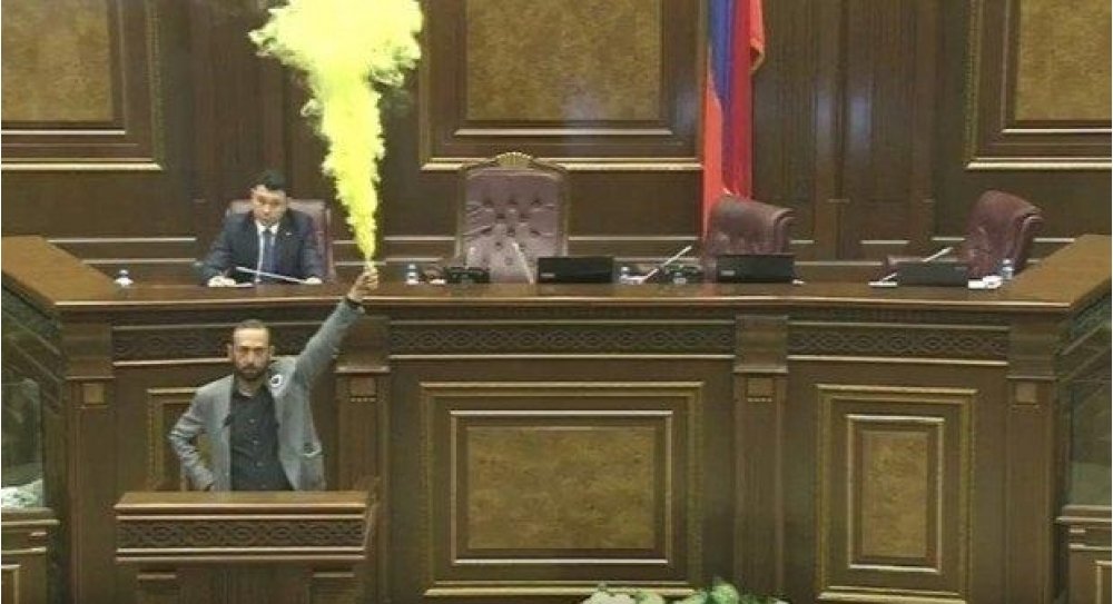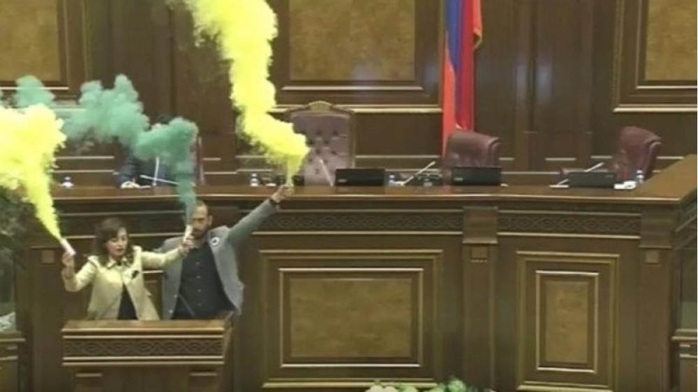Bundan sonra o, cibindən tüstü fişəngini çıxararaq yandırıb. Onu blokun digər deputatı Lena Nazaryan da dəstəkləyib. Parlamentinin bütün iclas zalını tüstü bürüyüb.